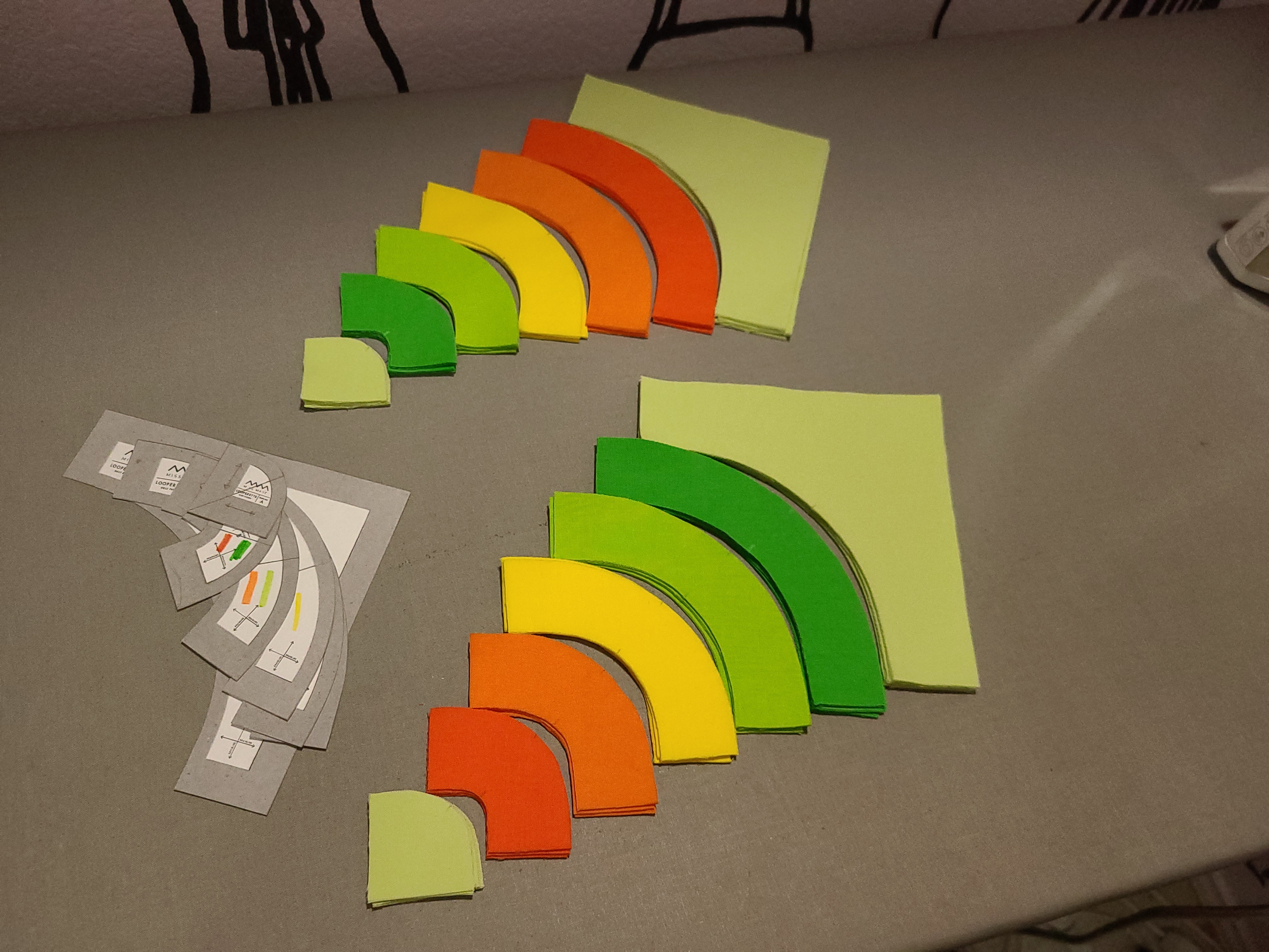I have decided on fabric color combination for a quilted Tamarak jacket (thinking it will be a shop display for selling a class at some point). I was actually able to shop my stash for all but the pale green I decided I like for the main background! I ordered a couple yards more of it after getting a half yard piece, and I'm really loving how the other colors pop on top of it.